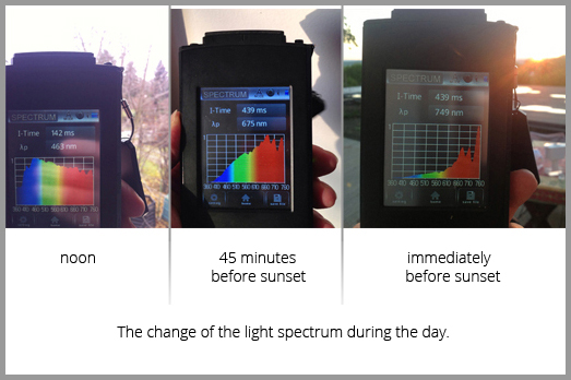 The photo demonstrates how the light spectrum changes as the end of the day slowly approaches in three spectral measurements: during the noon, 45 minutes before sunset and during sunset. It can be clearly seen that blue-rich wavelengths disappear almost completely yet the red ones are abundant. The reason behind this effect is the atmospheric filtering of these blue and bluegreen wavelengths caused by Earth’s rotation away from the Sun. Have you ever thought why the Sun appears orange during dawn and sunset?